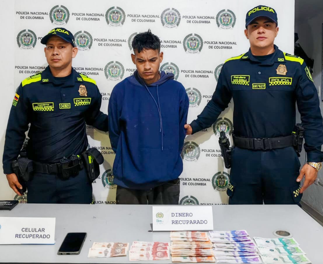 La Policía Metropolitana de Ibagué capturó en flagrancia a un hombre de 30 años en el barrio Cádiz. El detenido llevaba más de un millón de pesos y un celular presuntamente sustraídos de un establecimiento comercial, y quedó con medida de aseguramiento.
